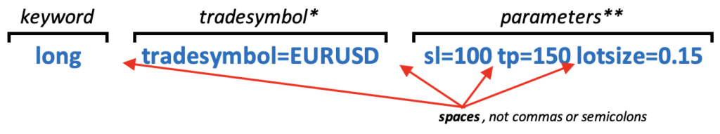 Alerts – for example ‘long tradesymbol=EURUSD sl=100 tp=150 lotsize=0.15’ must be constructed in a specific way