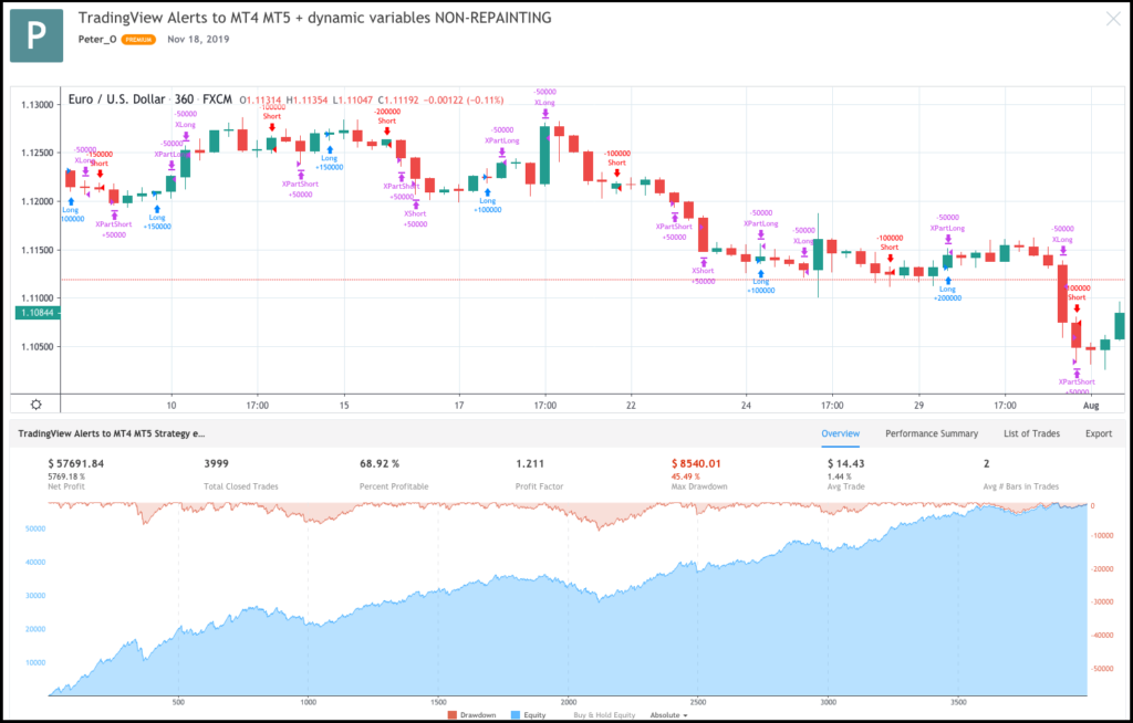 PineScript is TradingView’s proprietary scripting language used for coding trading indicators and strategies. Its simplified nature makes it accessible for tech-savvy people, yet coding noobs – after 2-3 weeks of digging into it, they can produce strategies of moderate complexity. The most simple trading strategy we can think of can be written in 7 lines of PineScript, while equivalent in MQL (C++-based native MetaTrader4/5 language) might exceed 100 lines.