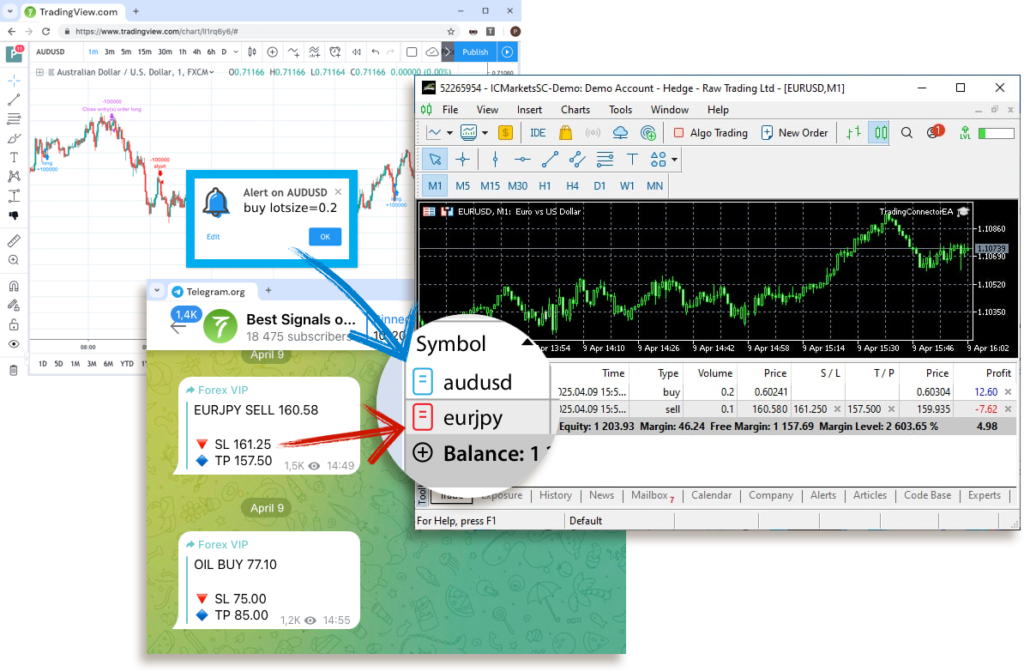 TradingConnector listens to alerts triggered by TradingView or on Telegram channels and forwards them to MetaTrader for lightning-fast and fully-automatic execution.