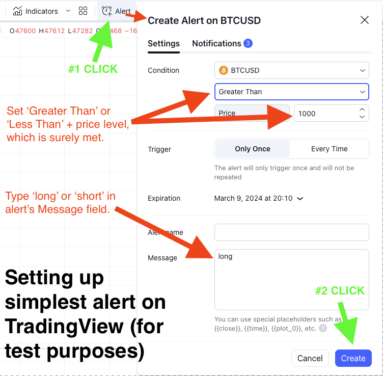 3. Type ‘long’ or ‘short’ in alert’s Message field. “Alert name” field is irrelevant.